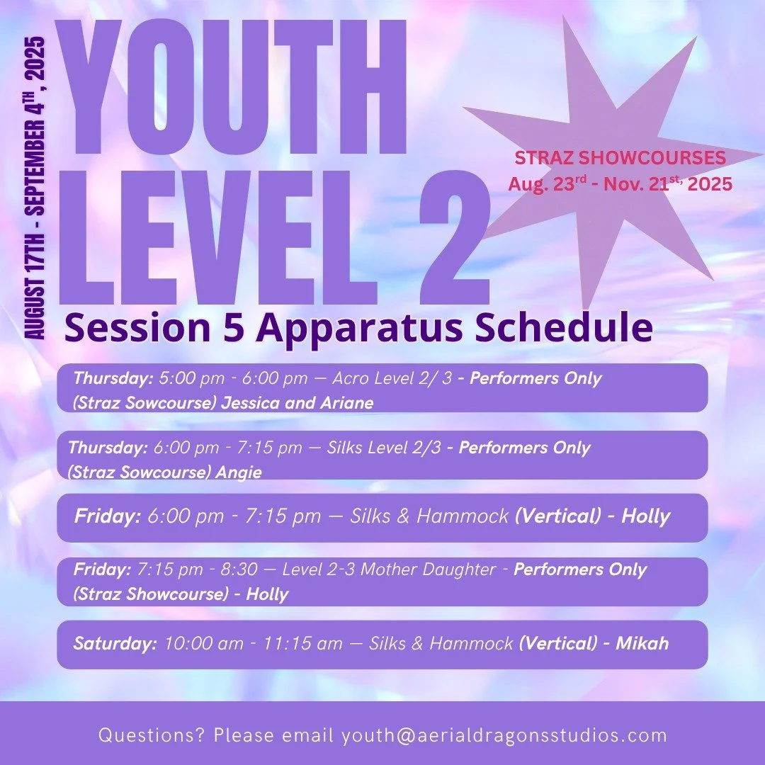 Our youth program is a one-of-a-kind way to keep your child active, inspired, and filled with wonder. Aerial arts are both a sport and an art form — and here, they’re so much more. At Aerial Dragons Studios, your child will gain strength, flexibility, agility, coordination, and balance. But beyond the physical, they’ll build confidence, mental resilience, social skills, lasting friendships, and a sense of self that they’ll carry with them on and off the apparatus — and far beyond the studio walls.
